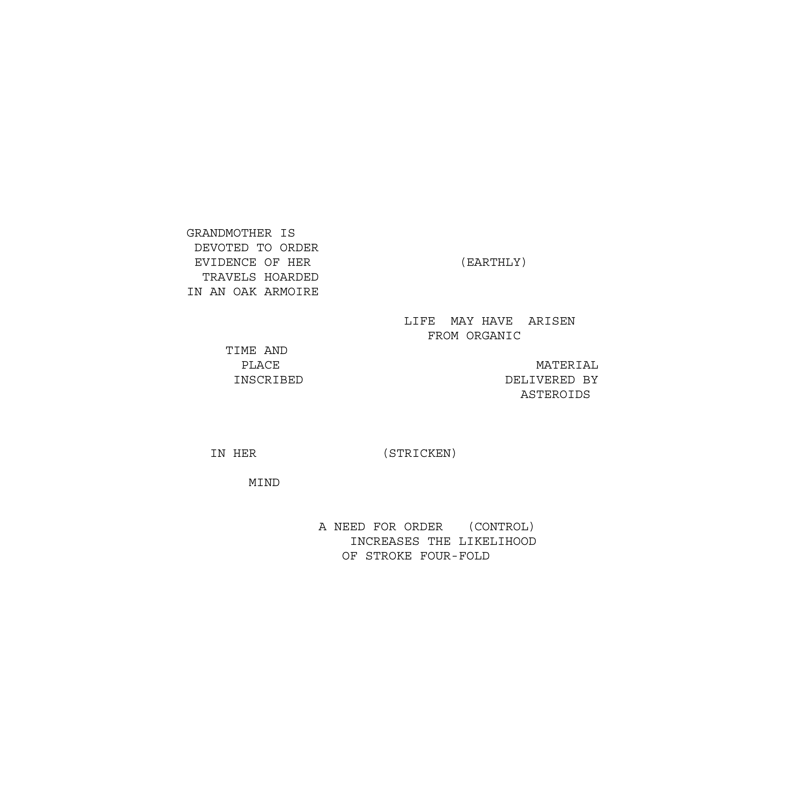 Astral Projection begins with families of asteroids — i.e., asteroids with related properties likely to originate from the same source — and overlays them with the mythologies of their namesakes and the biographical details of important women in my life. Associations between isolated fragments of text are uncovered in the manner of astronomers reconstructing familial relationships between fragments of spaceborne rock. These poems attempt to simulate the observation and interpretation of the transient bodies which inform our notions of history, position, and belonging within the cosmos.