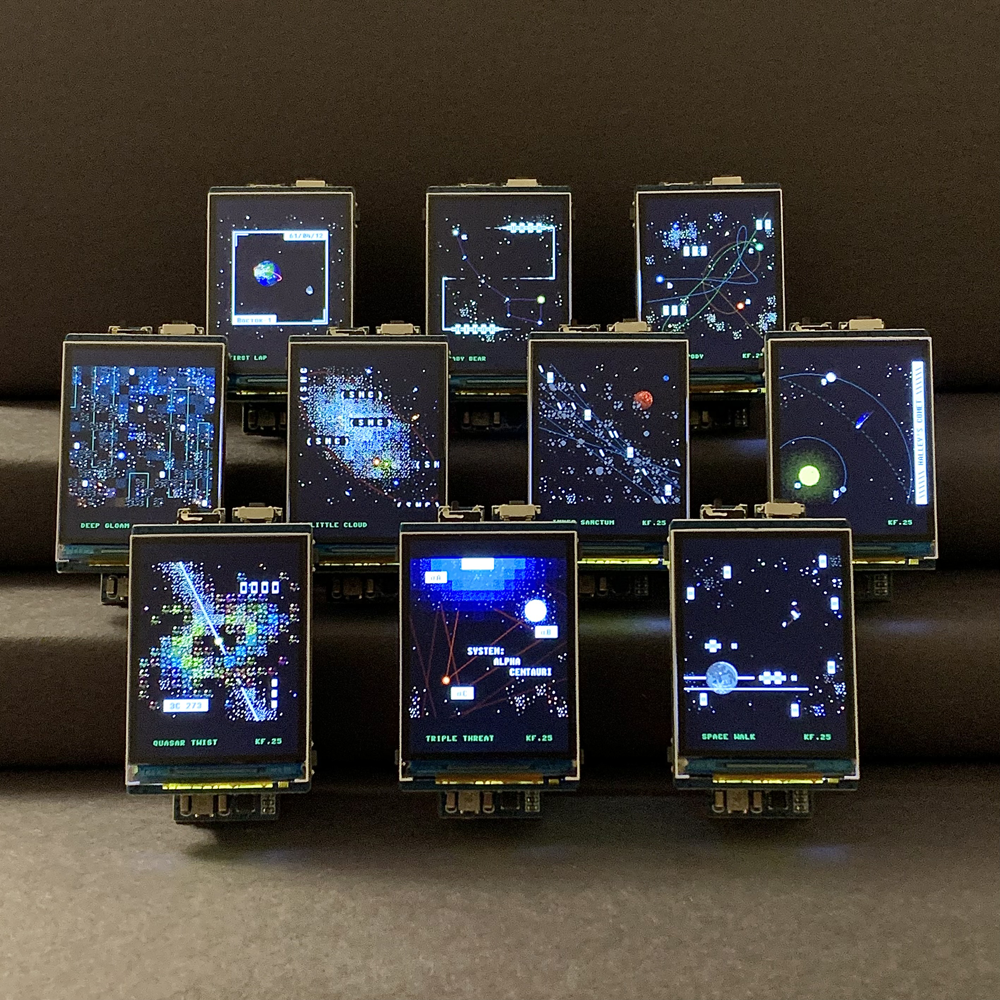 These artworks are permanently inscribed on the Tezos blockchain via a custom smart contract and do not rely on the third-party storage of their image data to function; they will survive as long as the Tezos blockchain survives irrespective of the fate of marketplaces or off-chain storage providers. The idea here is to find the most compact and permanent expression of cosmic imagery, to play with the mechanics of human knowledge — its inscription and transmission — with respect to an ever-changing, inhuman universe.