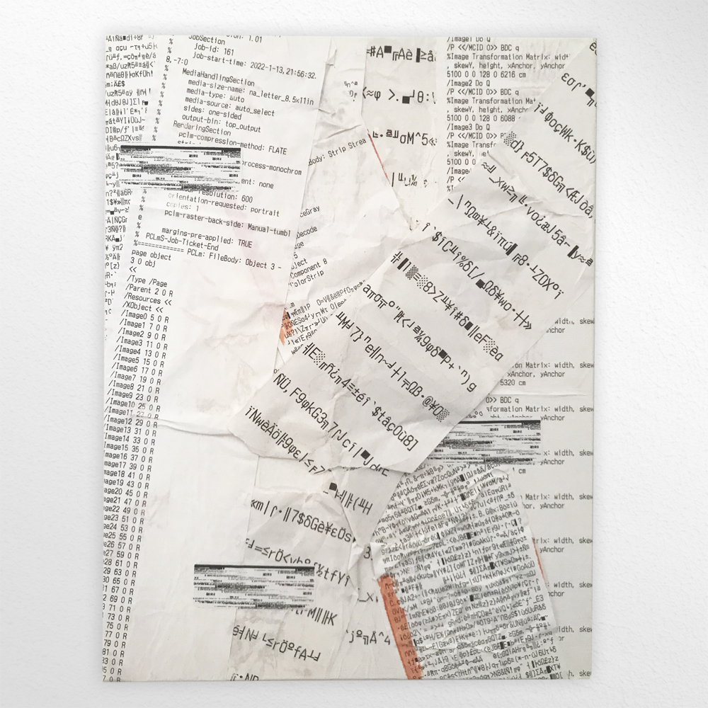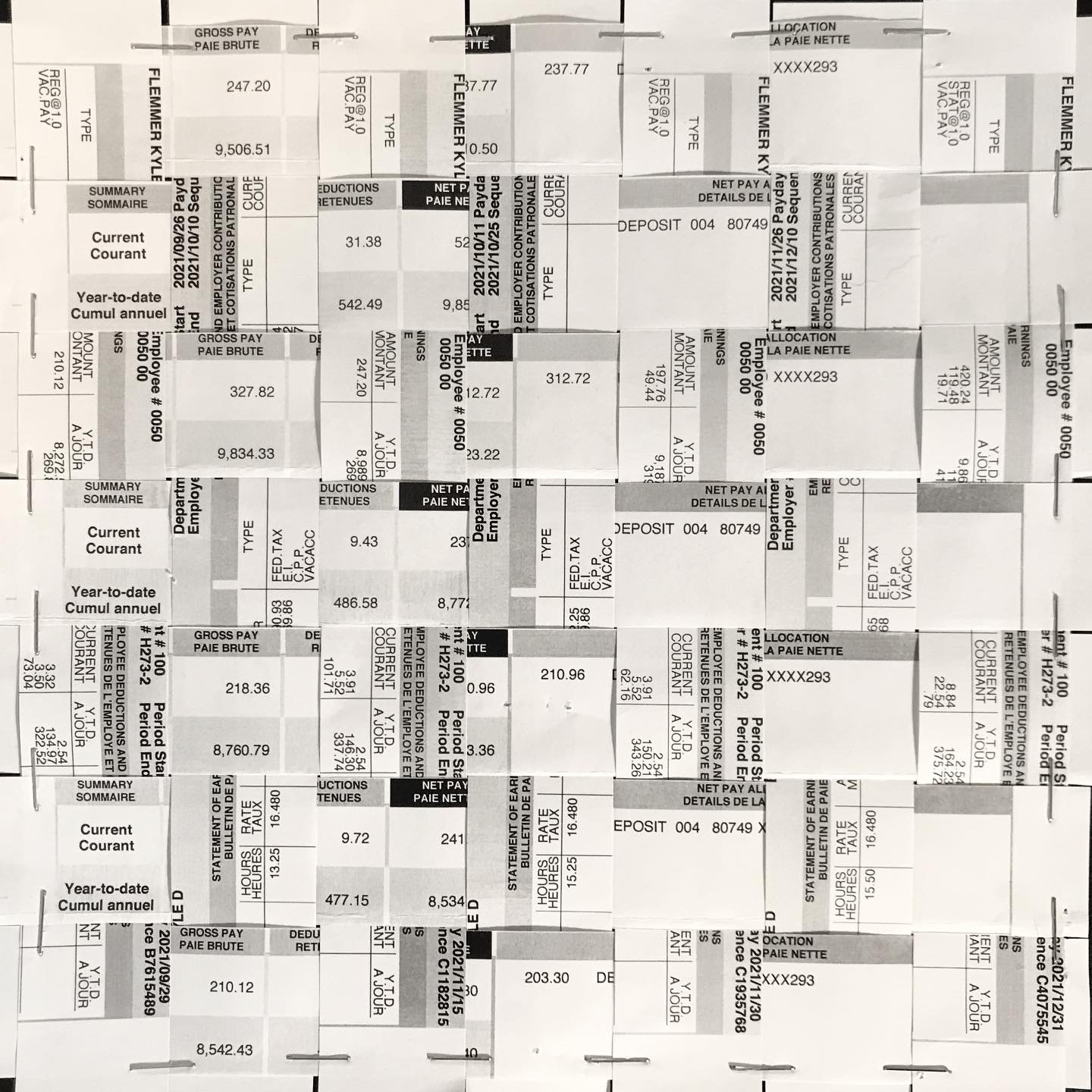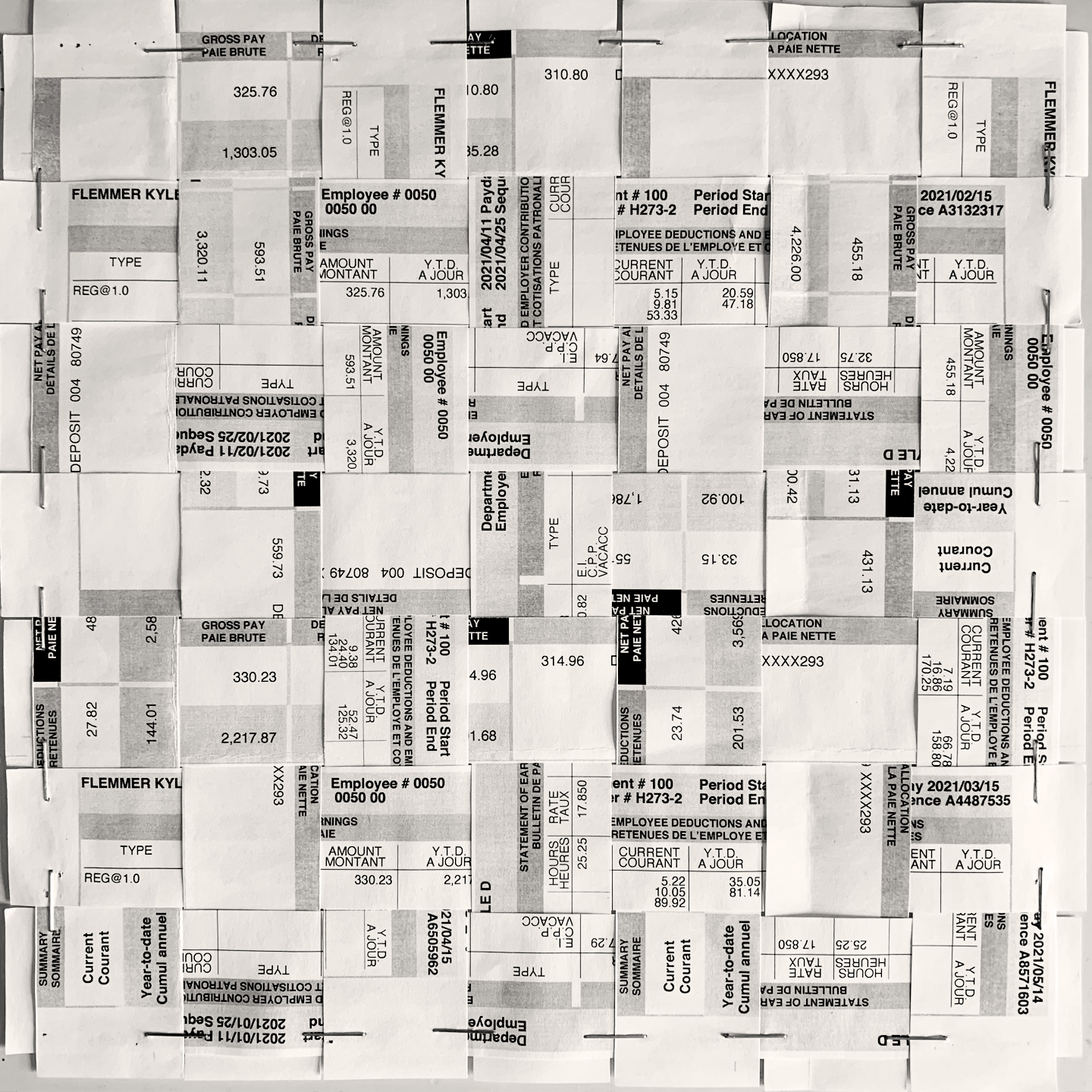 Weaving Accounts and related artworks were made in the summer of 2022 from paper materials collected while working my day job at a bookstore. The primary materials used include thermal paper covered in a chaos of letters, symbols, and printer diagnostics spat out at random by the store's receipt printer, sometimes in the middle of night, and my biweekly pay stubs cut into paper strips, similar to those produced by a paper shredder. These artworks explore the papertrails of small business operations, hourly-rate employment, and commonplace retail technologies, recontextualizing 'waste' and 'value' in a gesture toward the absurdity of artmaking as a working class person.