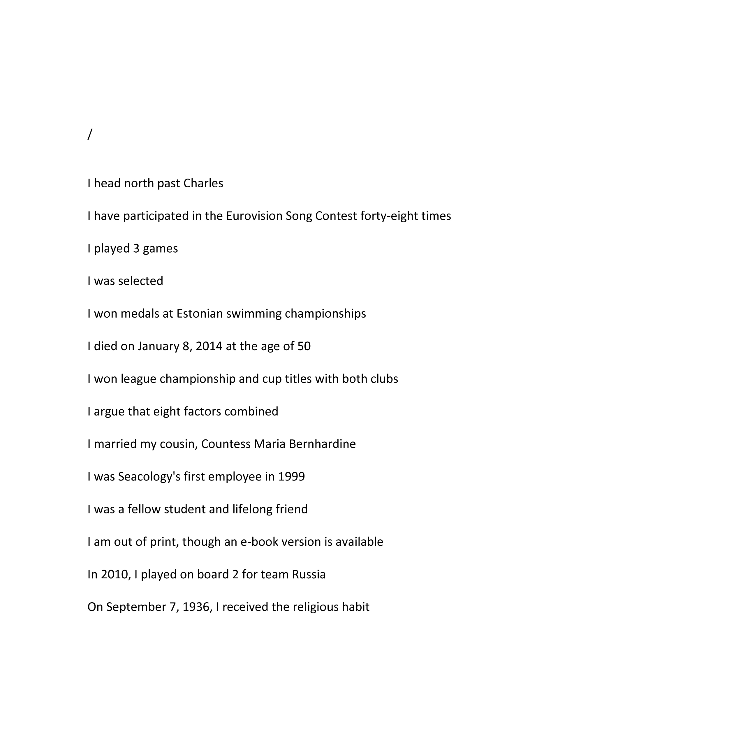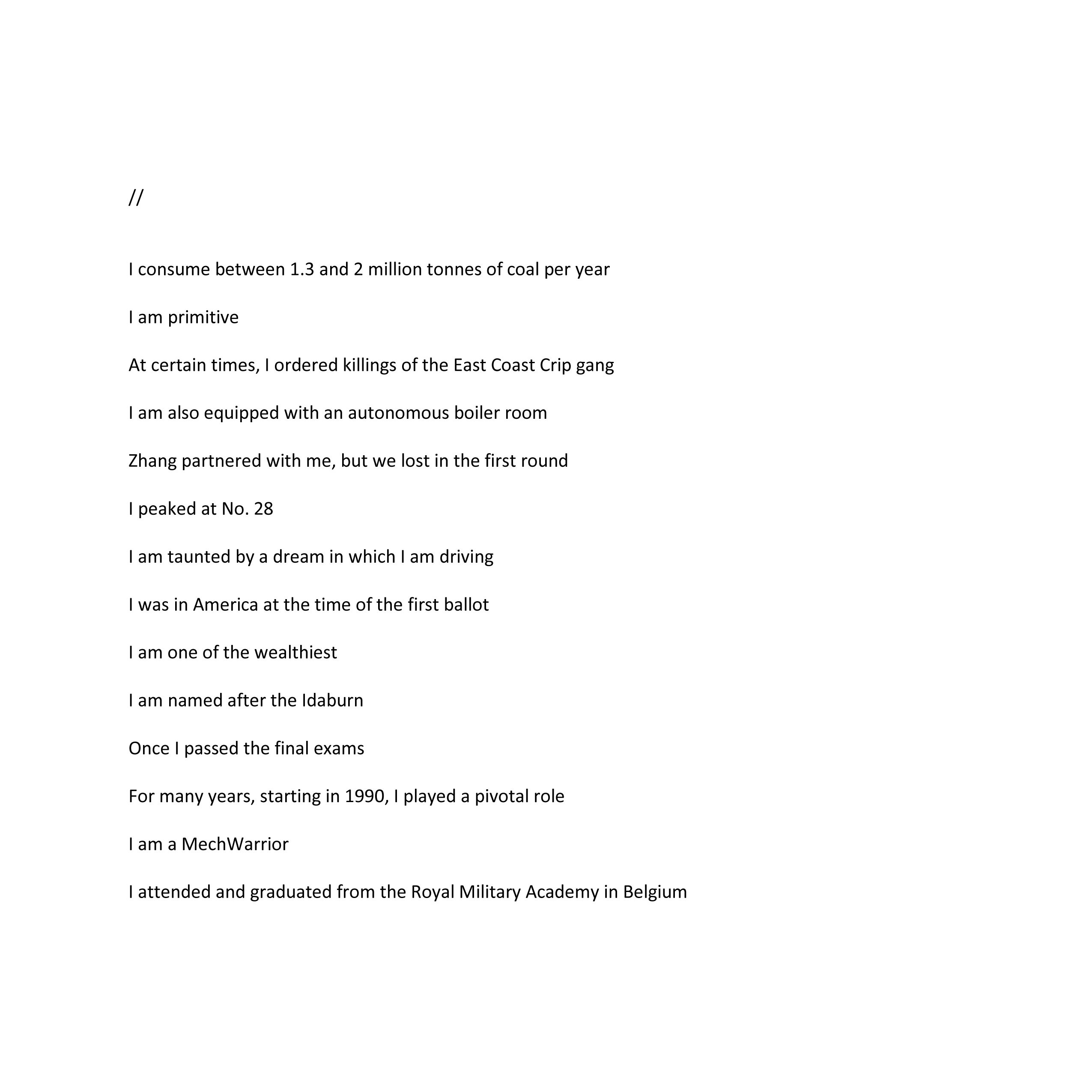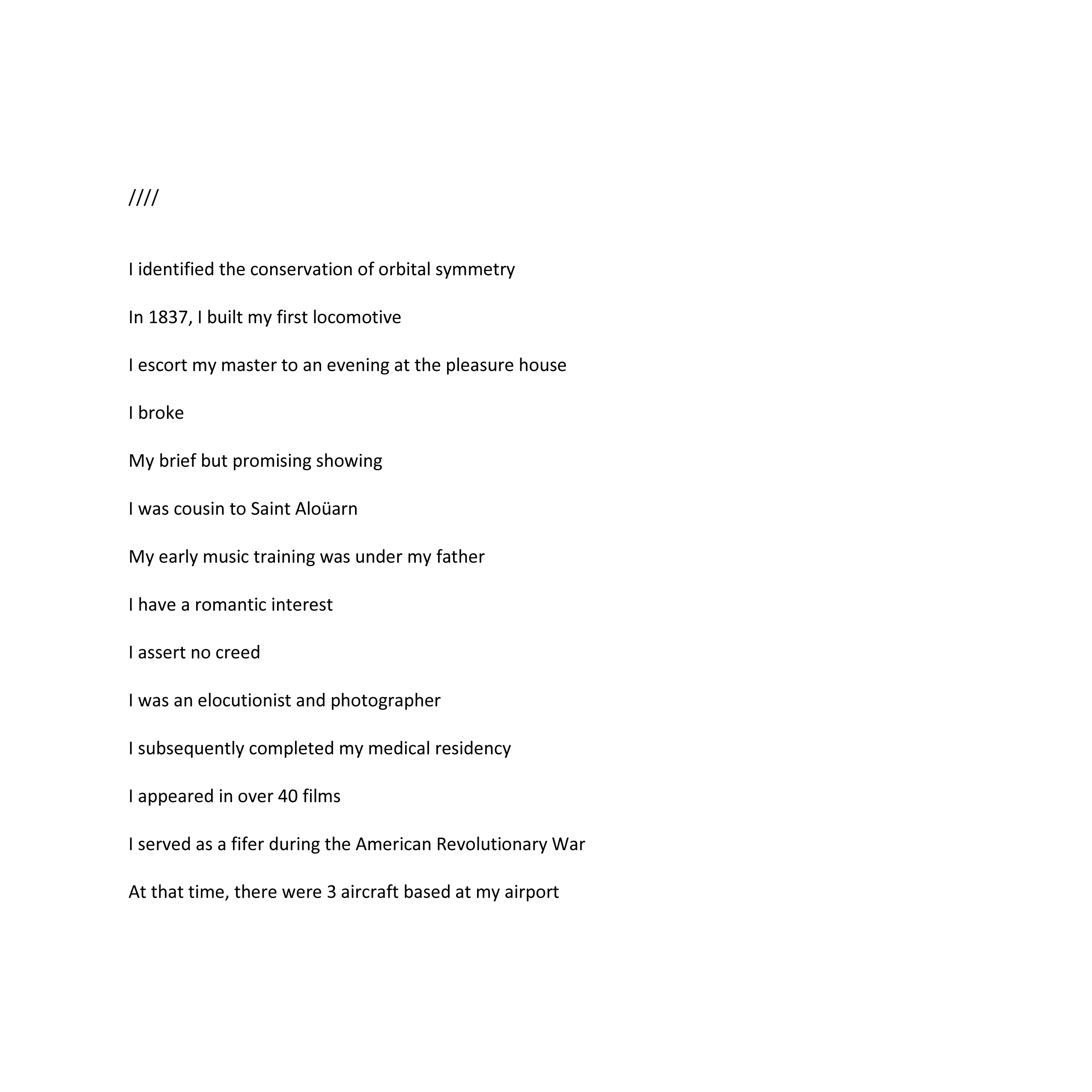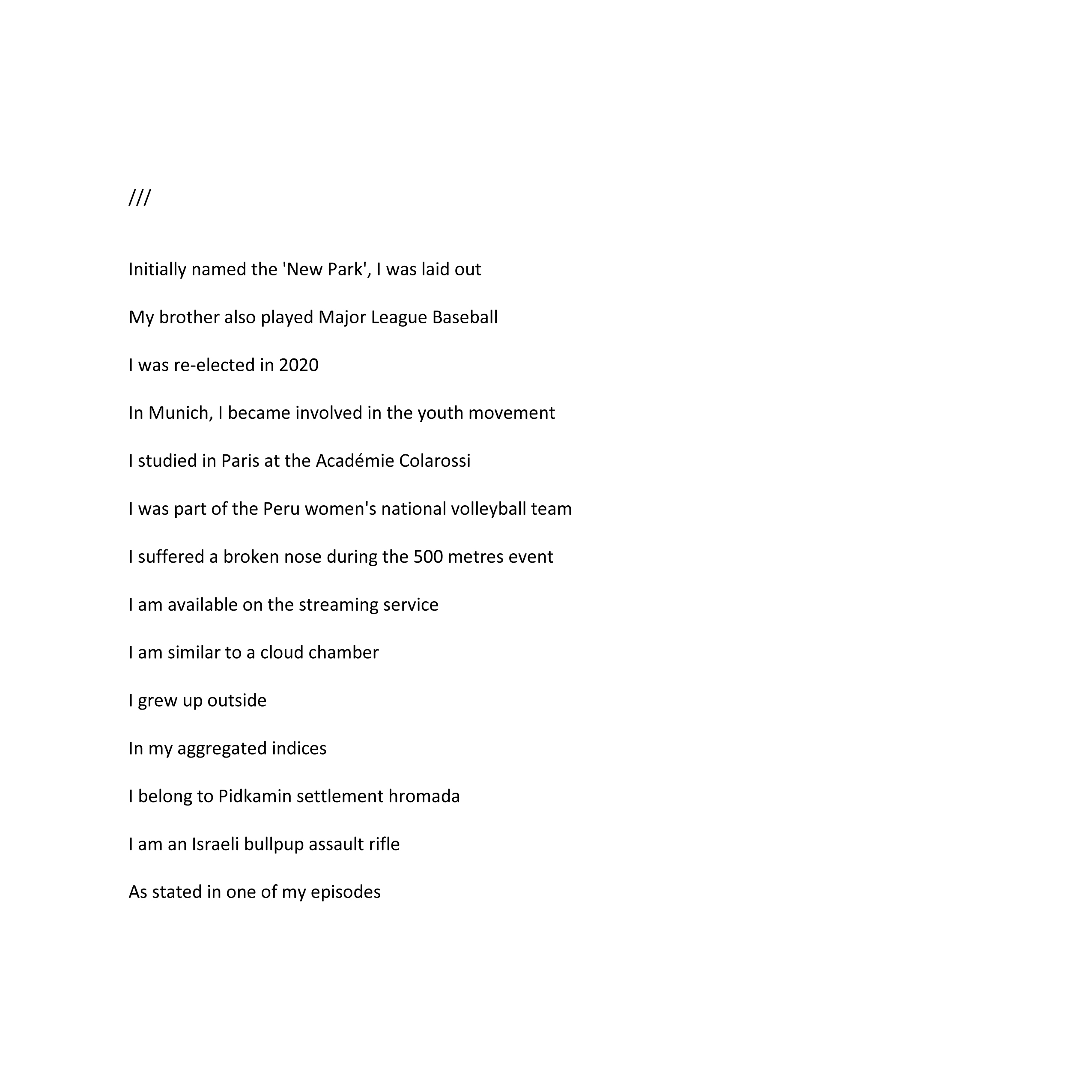 Wikipedia's 'Random article' function furnished the source material for this series of poems About me. After loading a randomly-selected article, a number generator was used to determined how much text to excerpt and from which sentence on the page. Pronouns and proper nouns from the source material were swapped with singular first-person pronouns — I, me, mine, and so forth — to subsume the doings of individuals, nations, and inanimate objects within my own life story.