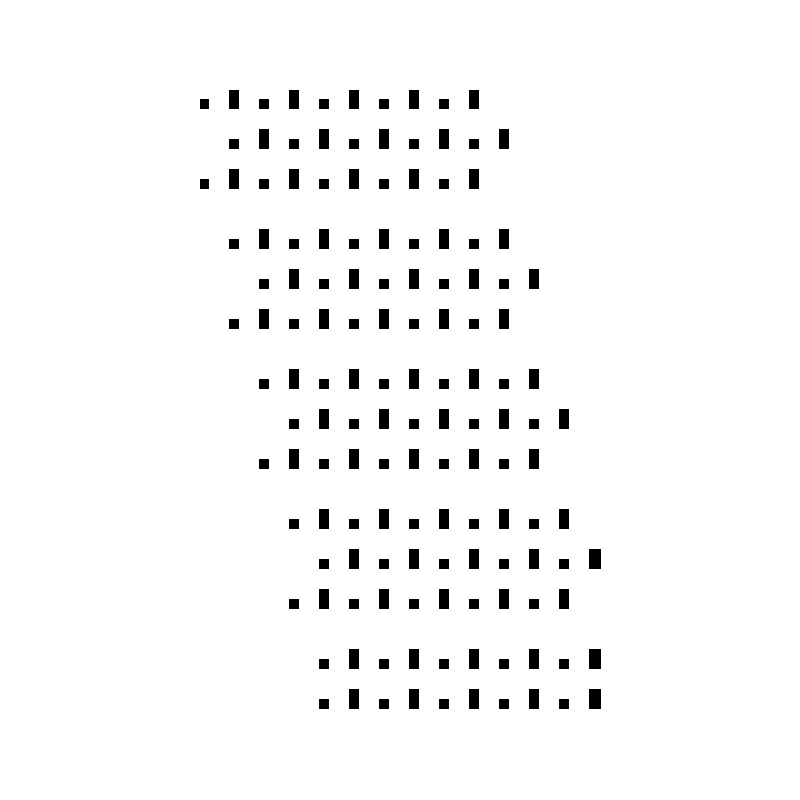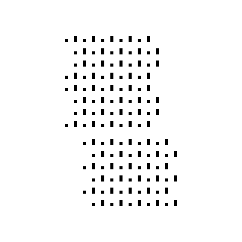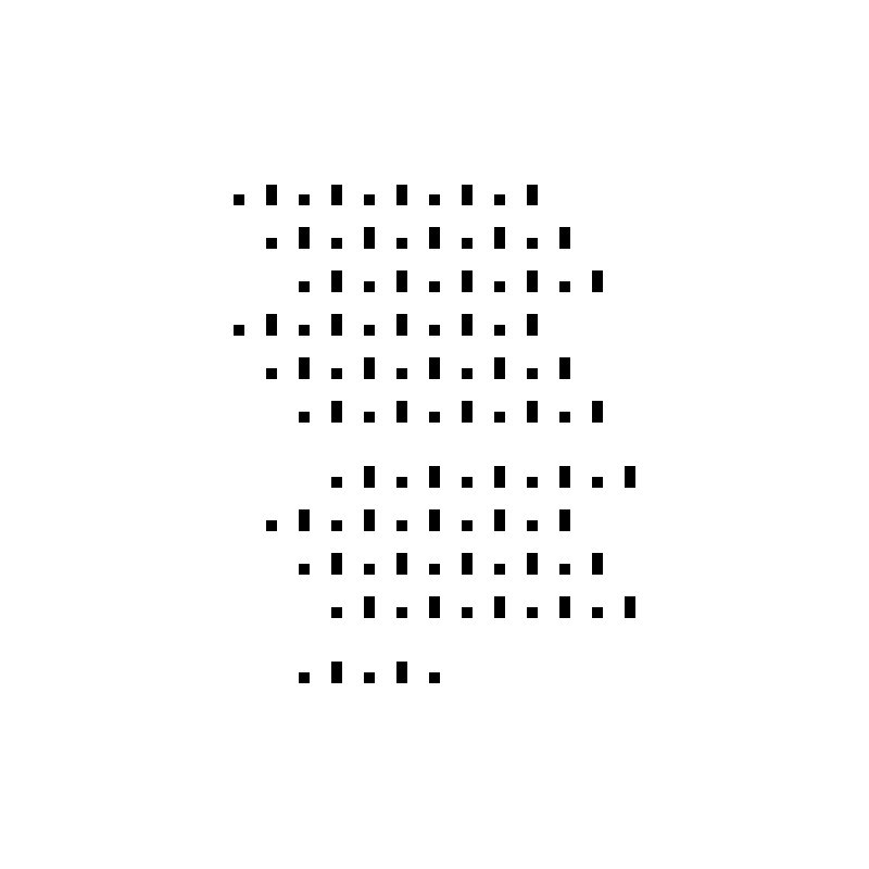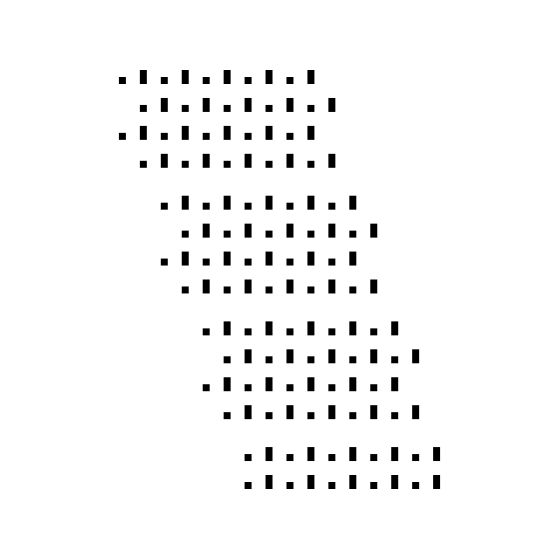 Little Songs reduces various traditional and modified sonnet forms (like Shakespearean, Miltonic, and Terza Rima forms) to their graphical minimum: 1 pixel for unstressed syllables, 2 pixels for stressed. Line spacing indicates a poem's stanza structure, while alignment correlates to its rhyme scheme. Variance from iambic pentameter, though common in sonnets, has been suppressed through all 10 visual poems. A limited edition of 50 copies of Little Songs was produced by No Press in 2022.