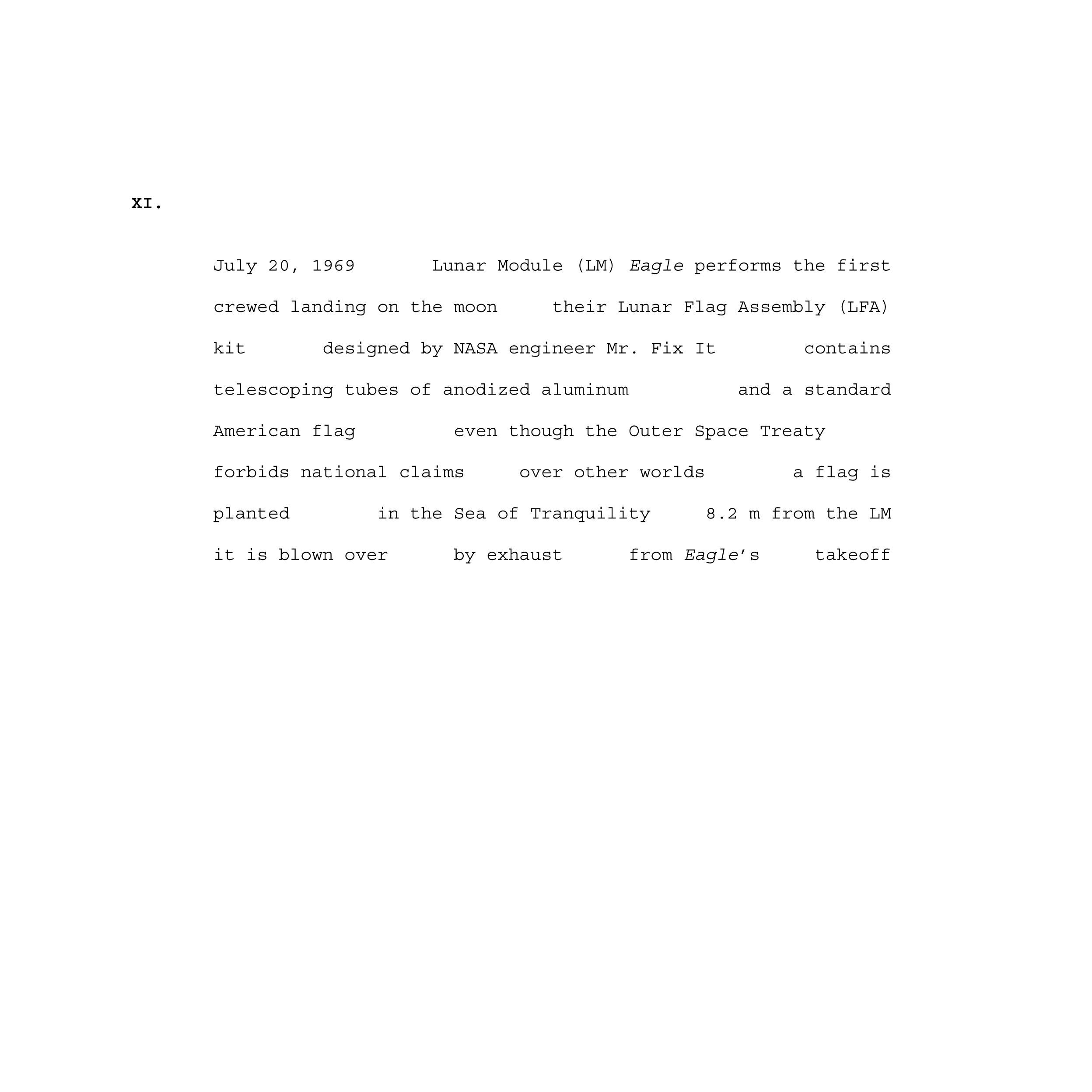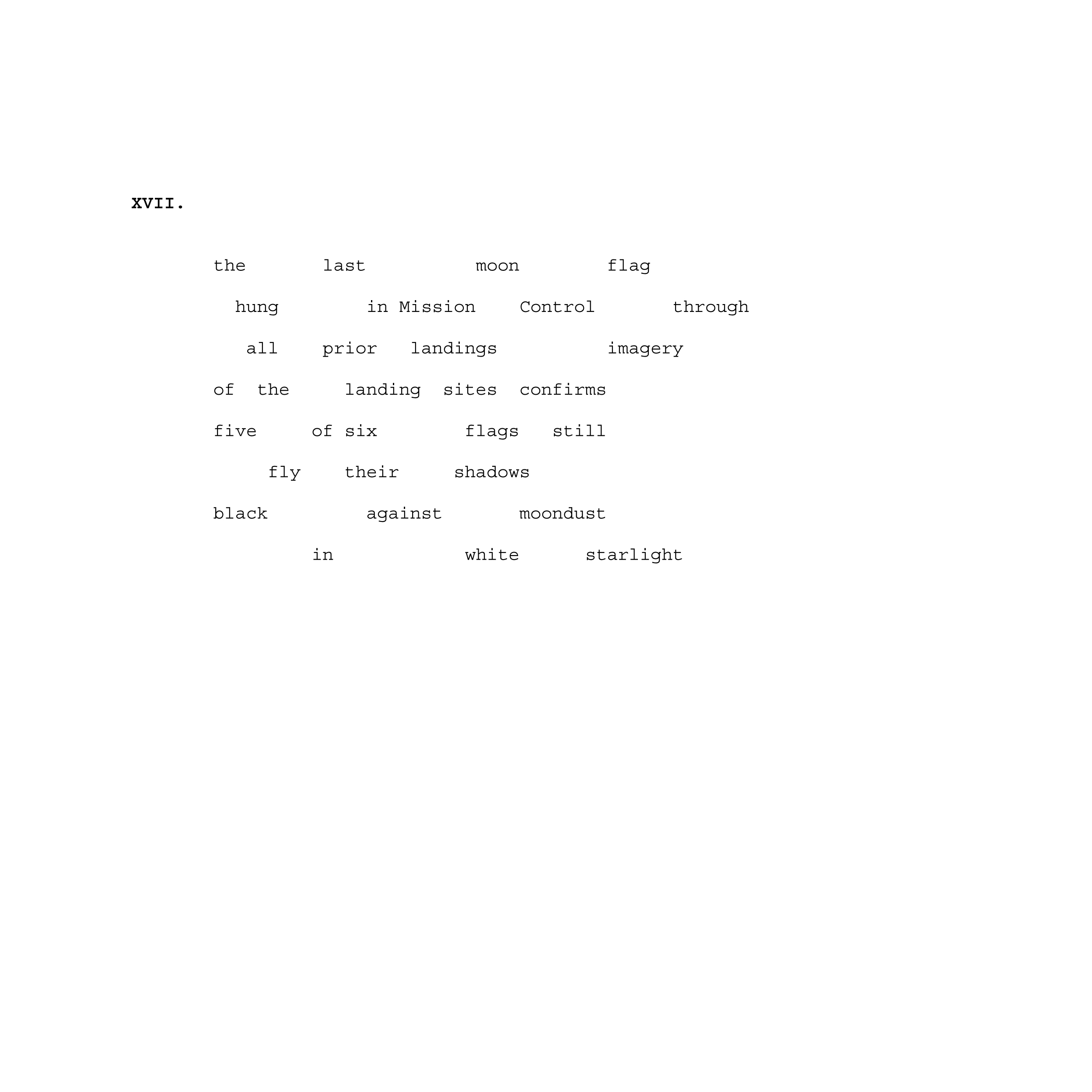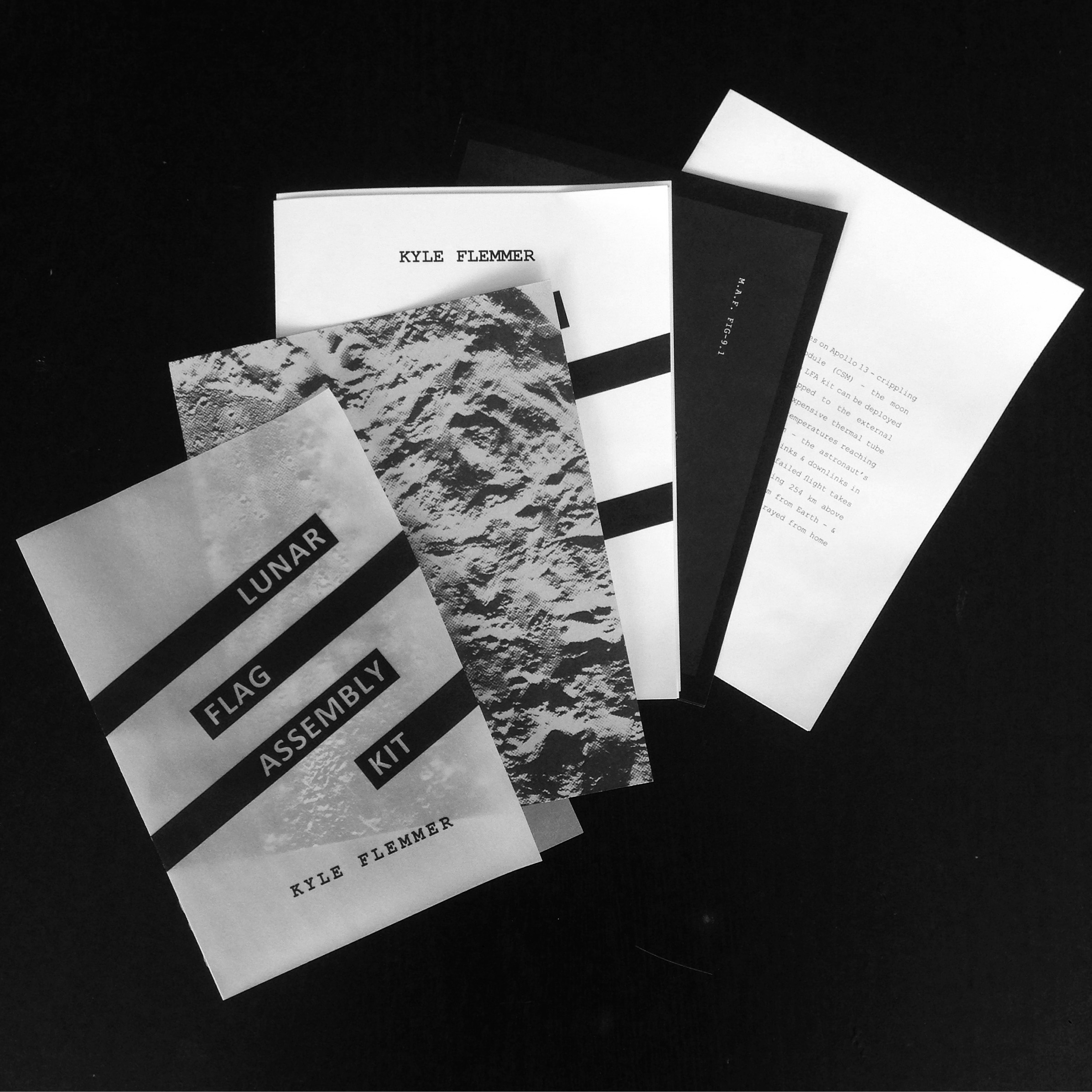 Experimental poetry at the intersection of science and modern mythology, Lunar Flag Assembly Kit chronicles the several symbols of human presence left standing on the moon. This project approaches feats of engineering, physical impermanence, and the politics of space exploration through visual poetry, erasure, and modularity to play with the ongoing legacy of the Apollo program.